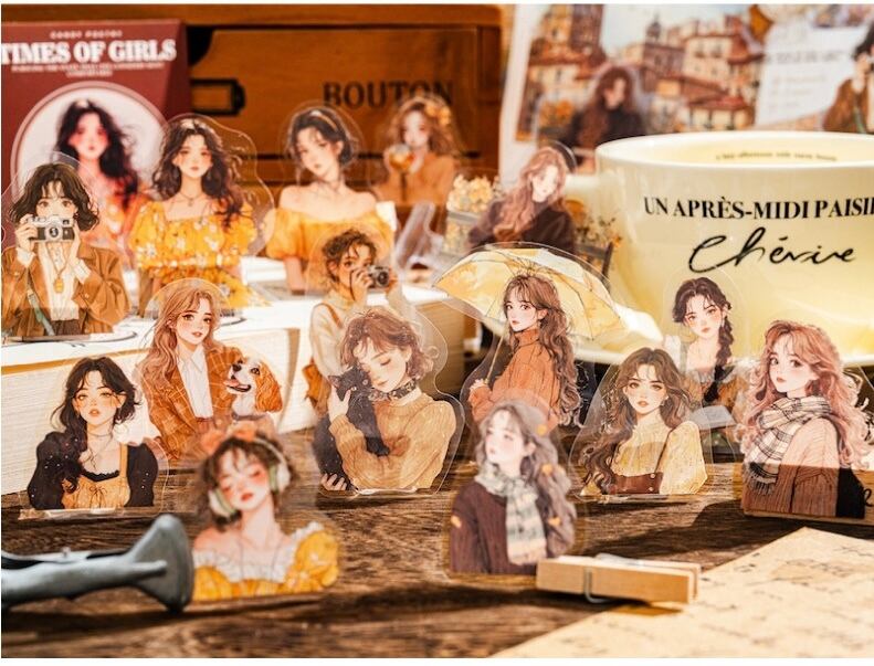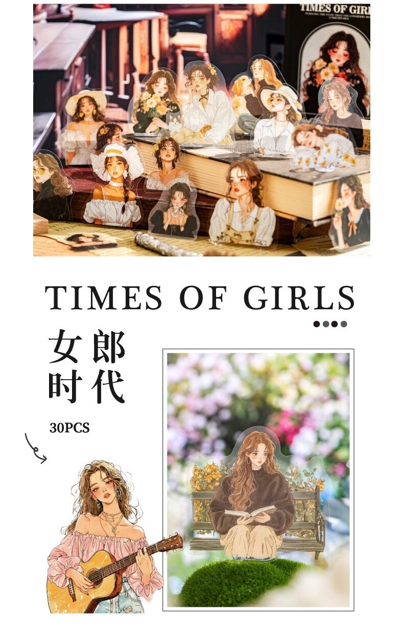 PET ホワイトインク ステッカーパック ガールズ エラシリーズ ヨーロピアン レトロ キャラクター デコレーション ベース コラージュ 30枚 6スタイル