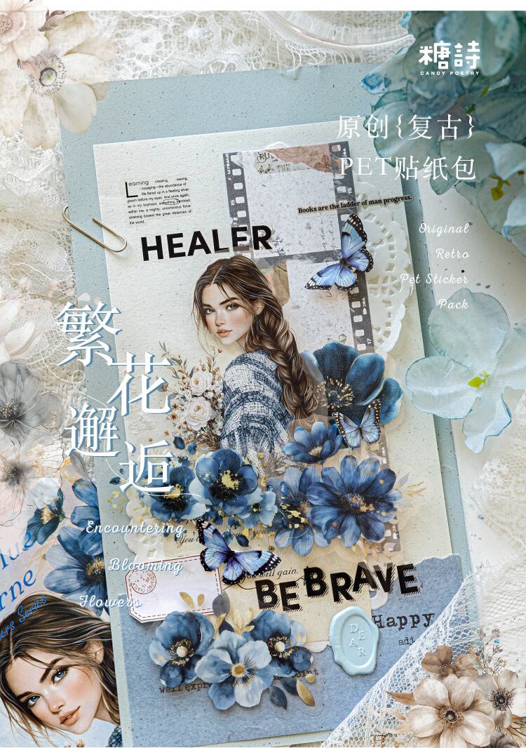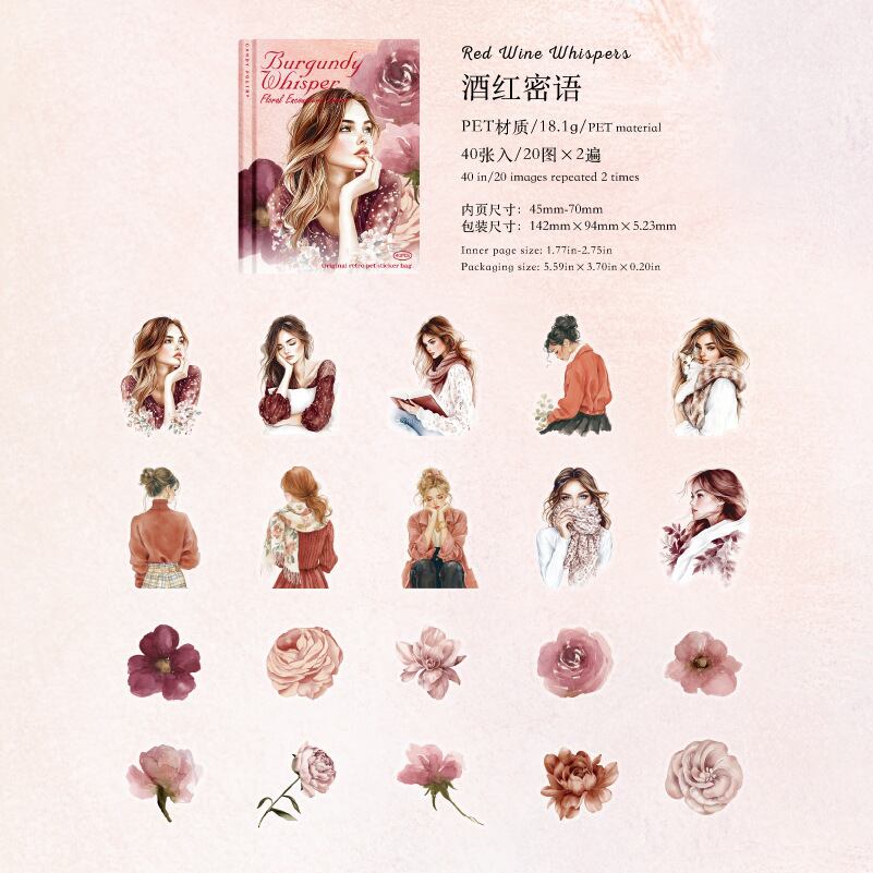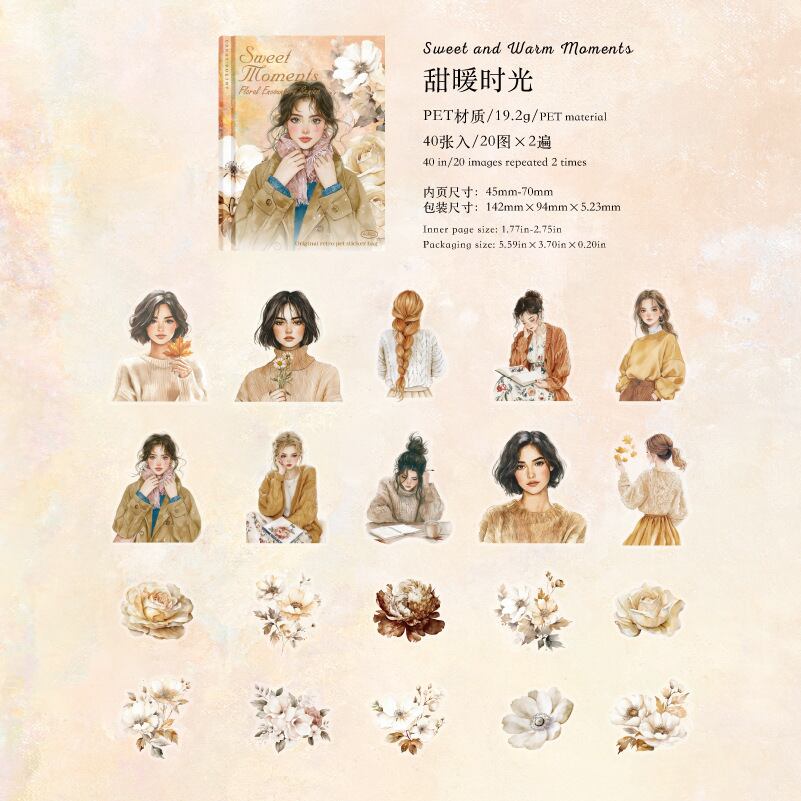 PET ホワイトインク ステッカーパック - フローラルエンカウンターシリーズ: 花と人物をテーマにしたジャーナルデコレーション 40 枚