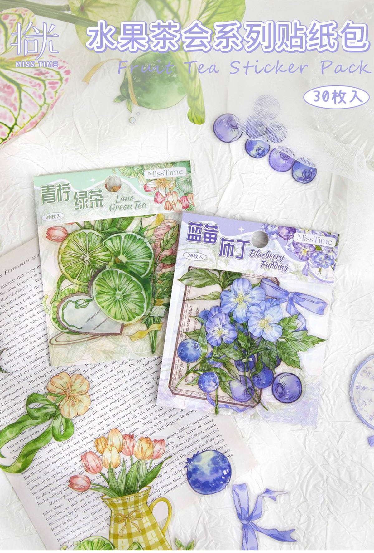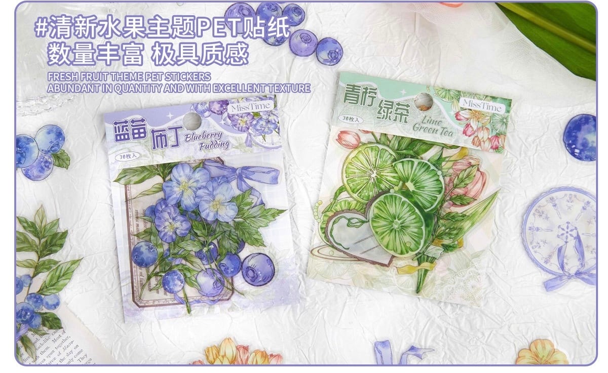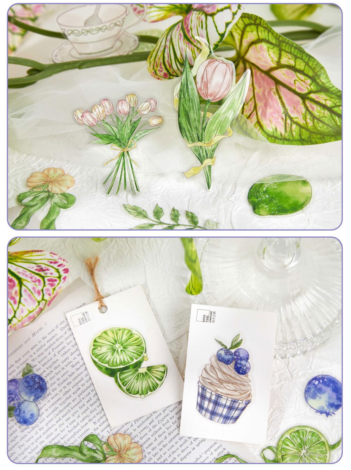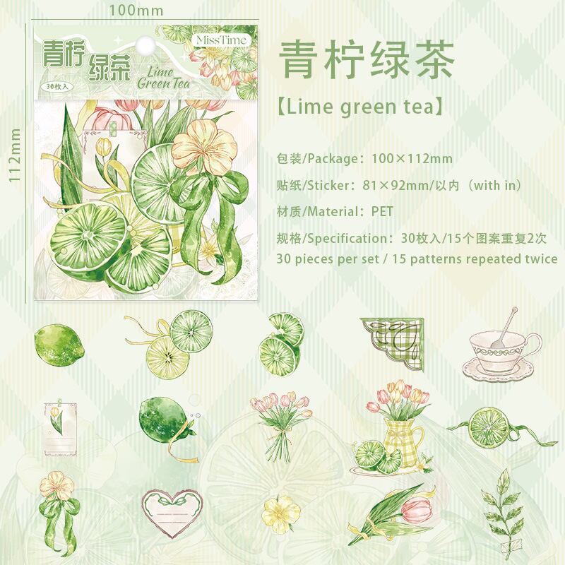 フルーツティーパーティーシリーズステッカーパック:花と植物をテーマにしたDIYジャーナルデコレーション(30枚、2デザイン)