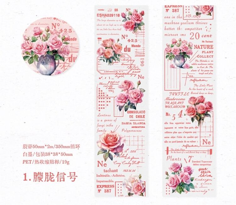 PET白インクテープ、薔薇の抒情詩シリーズ、レトロハンドブック素材コラージュベースステッカー6種