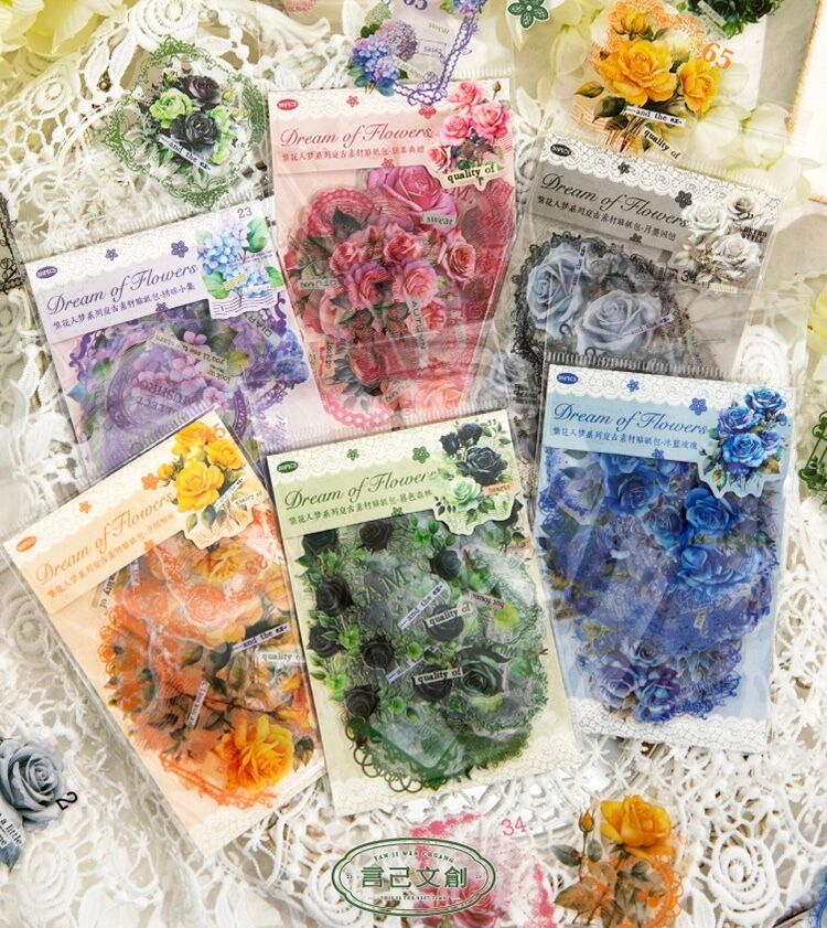 レトロ素材ステッカーパック、Flowers in Dreamsシリーズ、6種類のハンドブック素材装飾コラージュベースステッカー